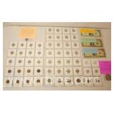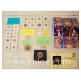 Group of misc collector's items; 150-AZ - 8 US Treasury Commemorative medallions - 8 various foreign coins - $10 Republic of Liberia Millennium coin 2000 - Mexican silver dollar - Mint error cent planchet - Walt Disney World Commemorative Medallion - American Revolution Commemorative medallion 1974 - First issue stamp "Telephone Spans the Nation" 1998 - 9 Fleer basketball card 1991