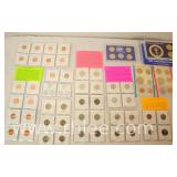 Group of 71 US coins; 150-AZ - 10 Brilliant uncirculated old Lincoln pennies 1957-1988 - 8 Lincoln commemorative pennies 2009 - 2 mint sets of steel war pennies - 6 coins 1943 - 6 Brilliant uncirculated Jefferson nickels 1974-1987 - 10 Westward Journey nickels 2004-2009 - 8 brilliant uncirculated Roosevelt dimes 1969-1991 - Proof set of 4 coins - Proof set of 5 state quarters 2005 - Proof/mint set of 2 Presidential dollars - Martin Van Buren 2008 - Mint sets of 11 coins