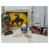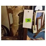 This is a unique liquidation auction of collectibles and antiques. There is a great variety of glassware, kitchenware, cast iron, dolls, skulls, pipes, linens, purses, furniture, repurposed items, and much more! This is an internet only auction! This is the first of 2 auctions. 1 Old wooden eight rung ladder Great for shop display. 1 Old wooden eight rung ladder Great for shop display. 5 Large Spanish framed print - 41" X 33" Artist Pinfet 7 Custom painted door, wolf painting on glass 57 x 28 inches 9 8 Point mounted Buck -