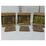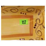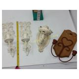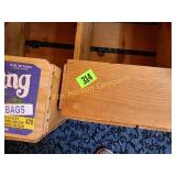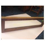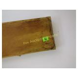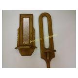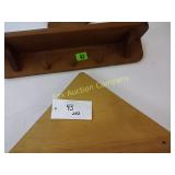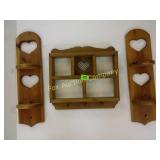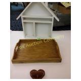 2 side shelves 21" long; center 14" wide x 3" and heart with wire backing 178 Beautifully Hand made wooden shelves One with mirror 19" long Shelf without mirror 2 feet long 179 Wooden serving tray, small wooden heart shelf And house trinket shelf 180 Burlap Purina Chows &
