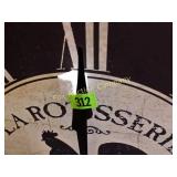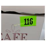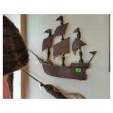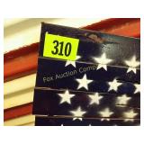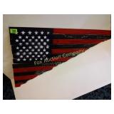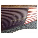 for the lodge 50" long, 24" deep, 36" tall 307 Vintage chair needs just a little TLC VERY unique 27" tall, 24"wide 308 Side table/magazine lamp stand With decoupage of old articles! 310 Heavy metal decorative flag 32 1/2" long 20 x" high 311 Tin roof American flag, 80" long, 27" high Just in time for the 4th!! 2 pieces 316 Spoon display case Wood with glass sliding door, 28x28 317 Decorative metal art