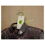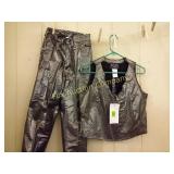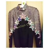 Pleather, pants size 1, matching vest size medium Vest by Natural Born Winner, blue is leather and stars are leather (sides are stretchy material) 158 Western apparel by Woods Western (black with stars) Green/black shimmery turtleneck Western Styles Collection size sm., (With embroidered flowers) 159 Bamboo lounge