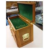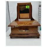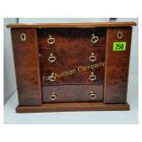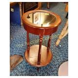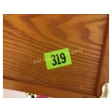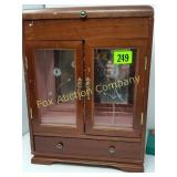 4' around, 18" high . 4 feet a crowd 18" high 319 Wooden chest for silverware or jewelry? Beautiful brass colored handles and locks on three front Drawers lined 21x13x9deep 327 Round Table with Display Case Top Some stain loss 330 331 332 333 336 |