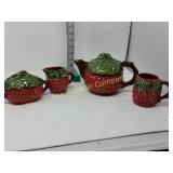 WORKS! Handlebar is broken. 116 127 136 Jay Wilfred Berry Tea Set Portugal division of Andrea by Sadek 147 155 Winter Brand vintage coat w/Fur Collar Fur collar, crushed velvet. Lined with small stain on inside of lining. Size Small 156 Felt skirt, Brown velvet Skirt, & Pants The black felt skirt is short, the brown velvet skirt is long, Size 11/12 plether (polyurethane ) pants 157 RODEO apparel by Western Ethics