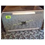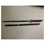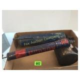 Bus Stop Sign Bus Stop Sign 12" × 18" 678 Display Case 5' wide × 22" deep × 38" high #1 Display area is 11" high 679 Display Case 5' wide × 22" deep × 38" high #2 The display area is 11" high 682 Brown Suitcase & Tan Case Brown case 25" x 14" x 10"-tan case12" × 12" × 7" 686 689 Bench/storage chest 31" wide, 15" deep, 5 high. With a little tlc this has great potential 694 Replica sword with Brass and felt case Intricate design on blade 696 Jack Daniel sample cart