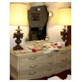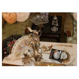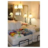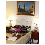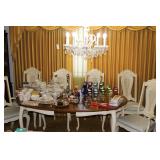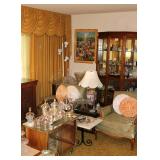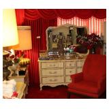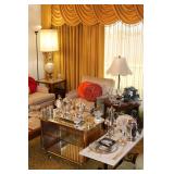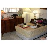 Well known high end / quality American furniture and other makers including: New Orleans Furniture Mfg. Co. Kroehler Pulaski Singer Furniture Virtue Brothers Mfg. Co., Los Angeles Custom of Las Vegas Hickory Manufacturing Co., Hickory, N. C. Milo Bauman chair Craftmatic GE Kenmore Imperial Philco Zenith Toshiba Several bedroom sets, all made in U. S. A. antique Bombe Style French Provencial Style 6 piece antique flame mahogany set Custom Las Vegas built queen bed and matching bench 2 Sofas 4 side chairs Fabulous mid-century tea cart in antiqued mirror, etched glass, figured wood and silvered trim Antique clock Gorgeous carved walnut bar Brass and glass étagère Many fabulous lamps Mid-century modern 5 globe chrome fixture Fabulous 10 light crystal chandelier Gaetano Sciolari glass rod chandelier Silver plate serving pieces and flatware Cut glass and crystal Original works of art and prints Japanese porcelains Rare pieces from Japan Several sets of china including service for 14 in Lenox Colorful cut to clear crystal stemware Frontier Hotel flatware U.S. military flatware Mid-century flatware (silver plate and stainless) Hickory Mfg, triple wide china cabinet Mid-century sconces Kenmore washer, dryer, upright full freezer Women’s high end clothes, shoes, hats, hat boxes, purses Some larger men’s clothes Wheels for a Mercedes E320