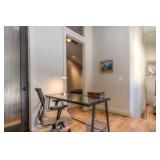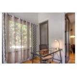 The furniture includes a number of beautiful and immaculate items from designers such as Room and Board, Crate and Barrel, and Brown Jordan. These items include, but are not limited to, two tufted loveseats, a large upholstered sofa, a studded ottoman, multiple accent chairs, a vintage bar cart, multiple side tables, multiple entertainment centers, mirrors, fire irons, lamps, a dining table with 4 chairs, clocks, a display cabinet with glass doors, multiple bookshelves, bar stools, a modern glass topped desk with chair, three beds of various sizes, side tables, dressers, rugs, an outdoor teak dining set, outdoor teak chairs and side tables, lounge chairs, outdoor modern round chairs, and more.