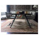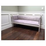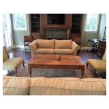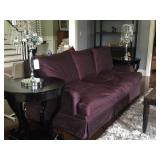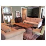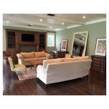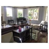 The furniture includes, but is not limited to a custom down purple silk taffeta sofa, a leather tufted Restoration Hardware sofa, 2 leather armchairs, a distressed wood coffee table, a custom Brenda Antin linen sofa, a Brenda Antin glass topped coffee table with cane accents, a lucite and glass accent table, two large dark wood etageres, multiple accents chairs, multiple side tables, a modern white dining table with 4 leather and chrome chairs, an antique oval wood coffee table on wheels, a Large dark wood Minotti Evans dining table, 2 Vintage Designer 1960's black lacquer spindle side chairs, a contemporary chaise lounge in blonde leather with metal legs, a queen bed, a shabby chic armoire with matching dresser and mirror, multiple sofas, a large outdoor sectional sofa and double lounge chairs, a teak storage cabinet, and more.