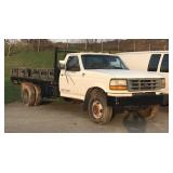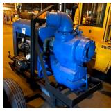 1992 FORD FLATBED DUEL WH. TRUCK, COMMERICAL GASOLINE DRIVEN PUMP ON CART W/ WHEELS.