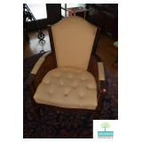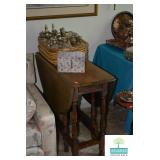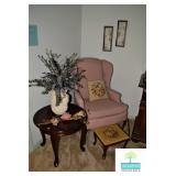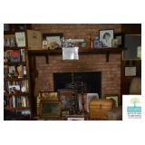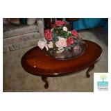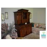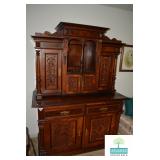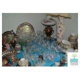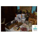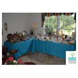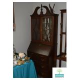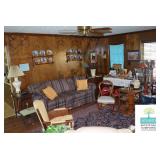 Living Room: Vintage Mahogany Secretary, Gate Leg Drop Leaf Table, Upholstered Sofa, Oval Dark Wood Coffee Table, German Hand Carved Chest, Small Balloon Back Chair, Wing Back Chair, Side Tables, Smalls, Silverplate, Glassware, Crystal, China, Collectibles, and More.