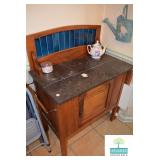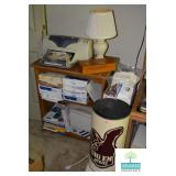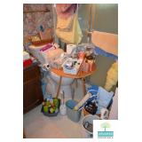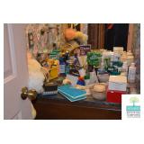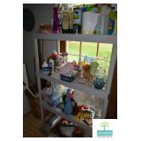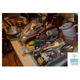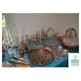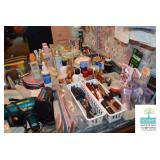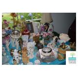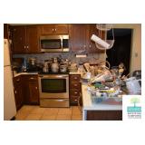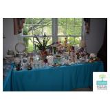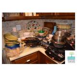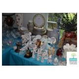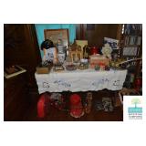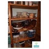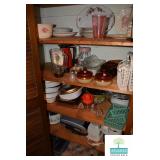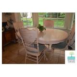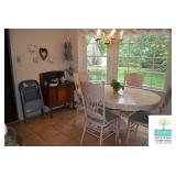 Kitchen: White Washed Oak Kitchen Table and Chairs, Small Washstand, Dishes, Bakeware, Glassware, Tupperware, Corningware, Vases, Smalls, Art, and More.