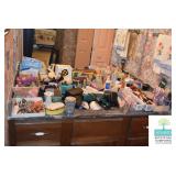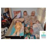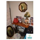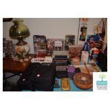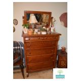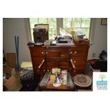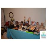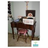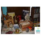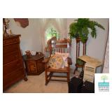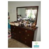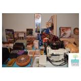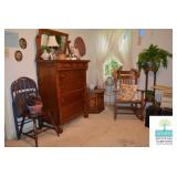 Bedroom #1: Antique Oak Tall Chest of Drawers with Beveled Mirror, Smalls, Clothes, Collectibles, Antique Dolls, Antique Oak Rocking Chair, Sewing Table with Iron Base, Small Singer Sewing Machine, Army Uniforms, Board Games, Old and Vintage Newspapers, Stainglass Lamp, Oak Vintage Side Table, and More.