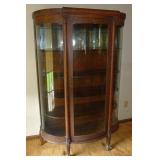 Antique Tiger Oak Cabinet. Victorian Tiger Oak Bow Front China Cabinet with Curved Glass, 4 wood shelves, partial mirrored back and claw feet. Measures 43" Wide x 16" Deep x 64" Tall. This does have a few scratches and scrapes but can easily be covered with Old English. Condition: Very Good for age |