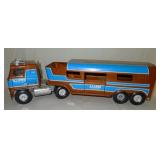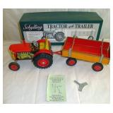 Vintage Schylling Toy. This is a fabulous Schylling tin Tractor with Trailer. The tractor has a shift-able transmission with 3 forward speeds and reverse, a handbrake, and working steering. The tractor and trailer are in like new condition with the original box, instructions and winding key. Together they measures 12" long. Condition: Very Good |
