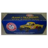 Collectible Diecast Truck. Ertl Collectible Arm & Hammer - 1946 Dodge Power Wagon. 1/25 Scale with original box. The truck has a winch on the front, a red gas can on one side and a spare tire on the other. The wording on the back panel reads “The Standard of Purity and Quality for Over 150 Years.” The doors and back bed panel open as well as the two halves of the hood. This measures 8 3/8” long. Condition: New |