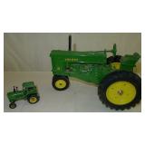 John Deere Tractors. John Deere 1953 - Model 70 Row Crop Diecast Tractor and a smaller newer Model John Deere with cab. These measure 2.5" and 8.5" Long. Condition: Good to Very Good |
