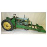 Vintage John Deere Tractor. 1950's John Deere with a front end loader. The spring on the loader has been stretched as pictured but is operational. Measures 13" Long. Good |