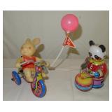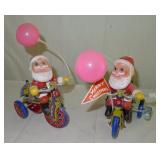 Vintage Tin Toys. Two 1950's Tin Litho & Celluloid Wind-Up Santa's on Tricycle Bikes with Bell. Both are holding a pink balloon and are in working condition. Condition: Very Good for age |