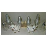 Collectible Hens. Indiana Glass Company “Hen-on-Nest” Dish. Amber Glass Hen with striated base measures approx. 7" Long x 5.5" Tall. Also includes a Ceramic Hen with Salt and Pepper Shakers and a small White Hen-on-Nest. This has several chips as shown. Condition: Good to Very Good |