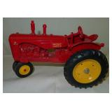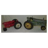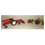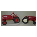 Vintage Tractors. Two red diecast Tractors - one is marked International. These were played with and show normal paint loss. Condition: Good for age |