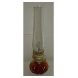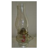 Vintage Kerosene Oil Lamps. Glass oil lamp with rounded bottom has a lovely design and measures 12" Tall including the chimney. Also includes an oil lamp with red metal bottom and finger handle measuring 11" Tall. Condition: Very Good for age |