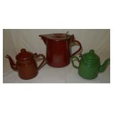 Ceramic Pitchers. Set of 3 Ceramic pitchers with beautiful color! The brown and cream pitcher is marked 347 and measures 7.5" Tall. The blue pitcher has 2 chips as pictured. Condition: Good to Very Good |