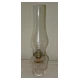 Vintage Kerosene Oil Lamp. This oil lamp has a round base with brass filler cap and measures 12.5" Tall including the chimney. The thumbwheel reads "Made in the USA". Condition: Very Good for age |