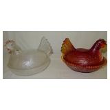 Indiana Glass Company “Hen-on-Nest” Dishes. 1950's Clear Glass Hen with smooth rim. Some of the red paint on the head has faded as shown. Also includes a Ruby Red Hen. The color does not extend throughout the glass, but is actually a red coating (flashing) over a light amber glass. Some of the red coating has faded as shown. Both measure approx. 7" Long x 5.5" Tall. Condition: Good for age |