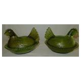 Indiana Glass Company “Hen-on-Nest” Dishes. Avocado Glass Hens with striated bases. Both measure approx. 7" Long x 5.5" Tall. Condition: Very good for age |