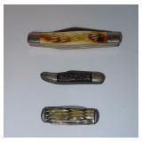 Pocket Knives. Set of 3 older pocket knives. The largest is marked Cuttin' Horse and is 4" long. The smaller knives measure 2.25" and 2.5" Long. Please see additional pictures for detail. Condition: Fair to Very Good |