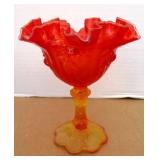 Orange Vintage Fenton Pedestal Art Glass Double Crimped Compote Amberina Cabbage Rose Very Nice |