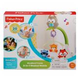 Fisher-Price® Woodland Friends 3-in-1 Musical Mobile. It's a musical crib mobile, linkable stroller mobile and take-along toy in one! 3-in-1 musical crib mobile with motorized action and four adorable animal friends (three woodland friends on the overhead mobile, plus a musical owl!) comforts and entertains baby at naptime or bedtime with 20 minutes of soothing lullaby music. When baby outgrows a crib mobile, Woodland Friends 3-in-1 Musical Mobile converts to a take-along musical owl toy that plays more upbeat music, and a linkable stroller mobile. Clip it to your stroller's canopy to take baby's favorite Woodland Friends on the go, and uses the musical owl away from home, too, to give baby a familiar face and playful, new music to enjoy.New!! Retail Price $24.99 |