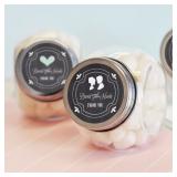 Chalkboard Lid Mini Mason Jars. Serve as a cute container for your treats, they're personalized and guests can use them for so many different things long after your event has passed - storing candy, nuts, chocolate, spices, loose tea, etc. The re-usable glass container comes with a screw on metal lid.4 Pack Brand New!! Varity Of Colors. Retail Price $4.00 |