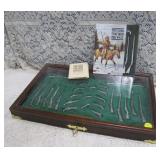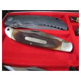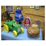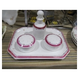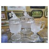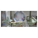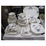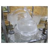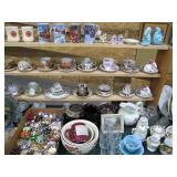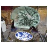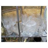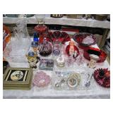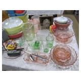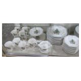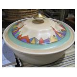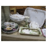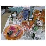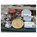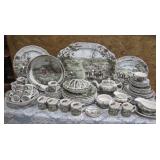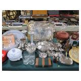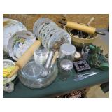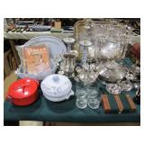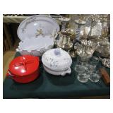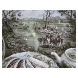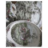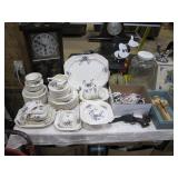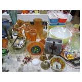 83pc. Tally Ho Johnson Bros. English Hunt scenes dinnerware w/serv. pcs.; Christmastime & other dinnerware; sterling silver candelabra & silverplate; sgnd. L.C. Tiffany Favrile footed mint dish; Westward Ho EAPG serv. pieces; Mt. Washington shakers; Carnival, Ruby, Amberina, Depression, cut & elegant to everyday glassware; asst. pottery; cookie jars; CaseXX kitchen knives; Pyrex; cookware; kitchenware; primitives;