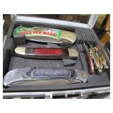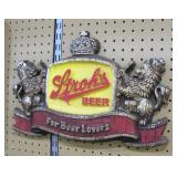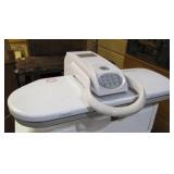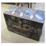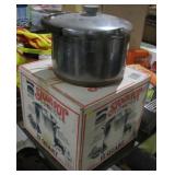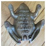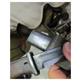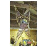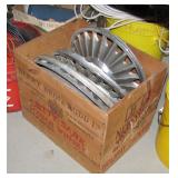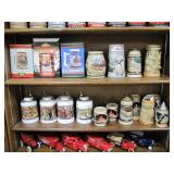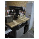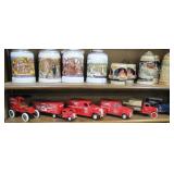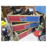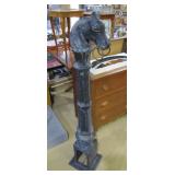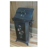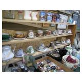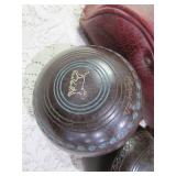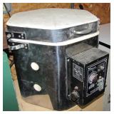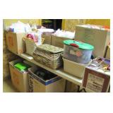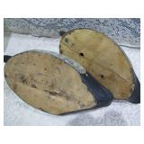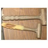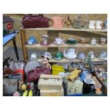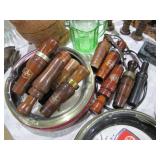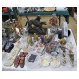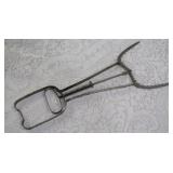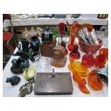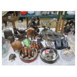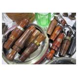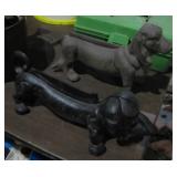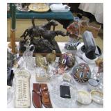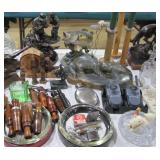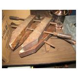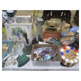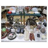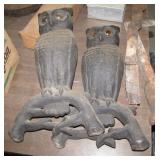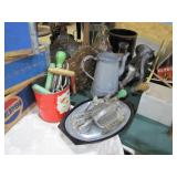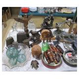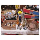 glass eyed Owl fireplace andirons; Empressa steam iron press; Whirlpool laundry tower; yarn, fabrics & sewing notions; beer steins & mirrors; cast iron dog boot scraps; glass fly traps; Henselite lawn bowls; wood crates & boxes; toboggan;