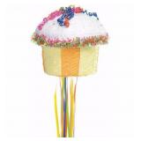 Multicolor Cupcake Pinata. Cupcake-shaped pinata perfect for any birthday celebration Colors: white cupcake with yellow and orange wrapper topped with multicolored ribbons as the sprinkles Made of paper Measures 11" x 9-1/2". Retails for $32.17. |