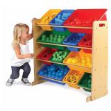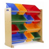 Tot Tutors Kids' Toy Storage Organizer with 12 Plastic Bins, Natural/Primary. Dimensions: 34 x 11 x 31 inches. 17.9 lbs. Removable toy storage bins for playtime and easy clean up. Easy to assemble toy organizer for blocks, crayons, toy trucks, dolls, and more is great for boys and girls ages 3 years and up. 12 rugged plastic toy bins are interchangeable, 8 standard and 4 large storage containers. Additional standard and large bins sold separately. Sturdy engineered wood construction is durable, easy to clean, and includes steel dowels to support toy bins. Perfect gift for boys and girls ages 3-8 years. Item is in original retail packaging. Assembly required. NEW! Retails for $59.98 |