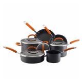 Rachael Ray Hard Anodized Nonstick 10-Piece Cookware Set, Orange. Set contains 1-1/2- and 3-quart covered saucepans; 6-quart covered stockpot; 3-quart/10-inch covered saute 8- and 10-inch French skillets. Hard-anodized aluminum construction with nonstick finish. Soft-grip bright orange silicone handles are oven-safe to 400 degrees F. Glass lids allow cooking monitoring without sacrificing heat and nutrients. Item is in original retail package. NEW! Retails for $155.88 |