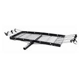 Tow Tuff TTF-2762KR Steel Cargo Carrier with Bike Rack. The Tow Tuff Cargo Carrier measures 27” x 62” x 3” deep, giving you plenty of room to take care of your various hauling needs. With a total weight capacity of 500 lbs., this Tow Tuff product can hold large loads. Constructed of heavy-duty steel for a durable product. The unique design allows this 2-in-1 carrier to function as a cargo carrier or as a bike rack by simply removing the pins to turn the bike rack into a cargo carrier or vice versa; fits 2" receivers for easy mounting onto your vehicle. Item is in original factory banded retail packaging. Assembly required. NEW! Retails for $147.69 |