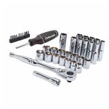 Husky Mechanics Tool Set,38-Piece. The Husky 38-piece 3/8 in. drive mechanics tool set is forged from Chromium-vanadium steel for outstanding durability and strength. The 25 different sockets allow you to tackle a wide range of basic fastening or repair projects. This Husky 38-piece set is ideal for any garage or your home workshop. Set includes one 3/8 in. drive ratchet, 24 standard and deep 3/8 in. drive 6-point sockets, 1 spark plug socket and 13 other accessory and drive tools.In the original case. Retail $24.97. |