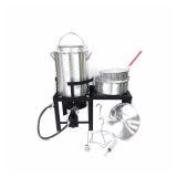 RiverGrille TF2133002 Deluxe Combo 30 Qt. and 10 Qt. Aluminum Fryer Kit. Fry turkeys up to 18 lbs. with the RiverGrille Deluxe Turkey Fryer Kit, which consists of a 30 Qt. aluminum pot with a lid and a strainer basket and a 10 Qt. aluminum pot with a heavy-duty steel stand that has a side shelf. The single cast-iron burner produces 38,000 BTUs of heat for great frying, and the kit includes a steamer, a lifter and a 12 in. thermometer. In the original box. Retail $99.97. |