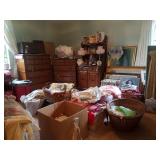 In this home you will find: Vinyl LPs, Handmade Antique Quilts, Heirloom Linens, Vintage Clothing from all Decades, Raggedy Ann and Andy Collection, Vintage Drinkware, Bar Stuff, Vintage Wool Blankets, A million Baskets, Lampshades to die for, Macrame, Art Glass, Pyrex, Fireking, McCoy, Antique Furniture, Cookie Jar Collection, MidCentury Small Furniture, Oriental Rugs, Fine Art, Ornate Frames and Mirrors, Old Playskool Toys, Antique and Vintage Wedding Gowns and Nighties, Cool Old Wooden Crates, Antique Steamer Trunks, Vintage and Antique Luggage in Great Shape, Needlepoint Benches, Chairs, and Pillows, Turn of the Century Furniture, Delicate Victorian Items, Books, books, books, and books, Patio Furniture, Brass Items, Amazingly Old Floor Lamps, and so, so much more. A feast for the eyes, and a delight for the treasure hunter in us all.