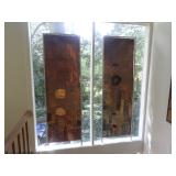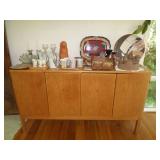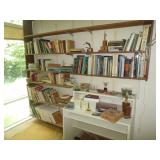 Many Mid-Century Items, Including Three Unique Window Panels Chair with Ottoman Bookcases Floor Lamp Table Lamp Teak Server with Original Key