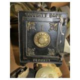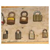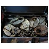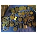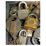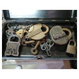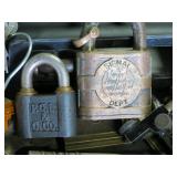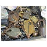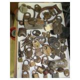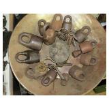 4 Silver dollars (1879, 1881-S, 1882-S, 1894-O); 2 silver halves (1917, 1936); 1920 USA Philippines peso; Indian head pennies (1905, 1907); very old W. Matden double-barrel shotgun w/ hammers, marked "London fine twist", unknown gauge; antique 24x28x41 safe; hundreds of old pad locks and brass padlocks (many w/ keys), including Indian lock, RR locks, Borden Institute front door lock, suitcase lock collection, US Navy lock, many other locks; brass keys, skeleton keys, & buckets of keys; small key cutting machine; brass mailbox doors; sets of brass face scales; brass yard & steel yard; 5 brass blow torches; brass grease guns & oilers; antique school bells; brass fire extinguisher; antique fireman's nozzle & other nozzles;