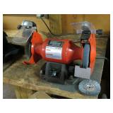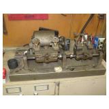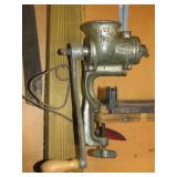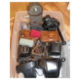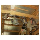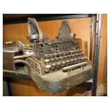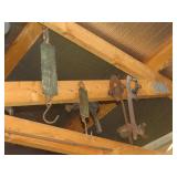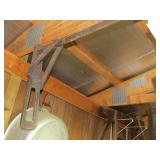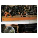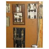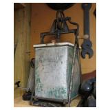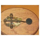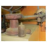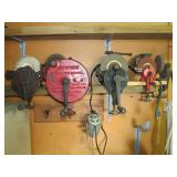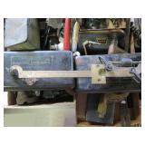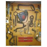 Oliver typewriter; Howe balancing scales; cast iron skillets; antique banks; Grayball bank; Corydon capital bank w/ key; unusual child's bank (like safe); tin-type photo album w/ photos; several antique cameras & home movie cameras; Daisy metal churn; antique desk crank phone; 20 or more glass insulators; antique medicine bottles; collectible milk bottles; Big Top Jumbo peanut butter glasses; old fuse switches; lamp parts; apple butter stirrer, complete; Russwin #3 food grinder; Coca-Cola box; arrowheads; Trilobite Calymene fossil; fossils; rocks; 10 pr. handcuffs; shackles; Craftsman 4" belt sander; B&D electric grinder; electric drill; electric saw; table saw; extension cord; flashlights; small vise; burring reamer; taps & dies; chisels; shears; pliers; rasps; nippers; pipe wrenches; screwdrivers; small tools; C-clamps; furniture clamps; squares; springs; nails; screws; bolts & nuts; Bluegrass tool box; tool boxes; metal stamping sets; cable cutter; rakes; shovels; other hand tools; metal folding ruler; table on wheels; 6-drawer parts cabinet; small Keepsafe safe w/ metal drawers;