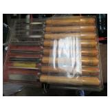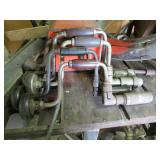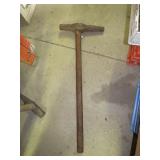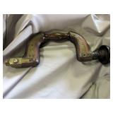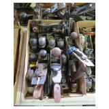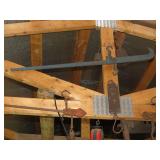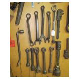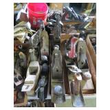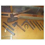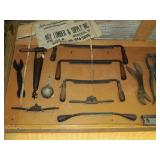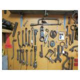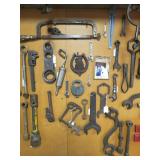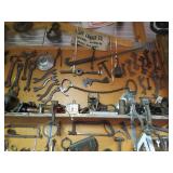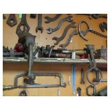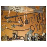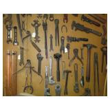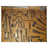 RR signal box; RR rail for anvil; "A Pioneer Railroad" by Frank F. Hargrave; Monon RR corn meal bags; Monon RR spike hammer; 20 collectible hammers, incl. Bluegrass & Belknap; Keen Kutter hammer; Keen Kutter hatchet; Keen Kutter hack saw; Keen Kutter saw; antique saws; 2-man crosscut saws; hack saws; dozens of hand saws; hatchets; antique throwing hatchet; broad axe; axes & axe heads; augers; braces & bits; unusual wooden brace; 2 breast drills; Fuller Brush drill; 10 wooden planes; 40 planes; 6 antique draw knives; several small knives; wrecking bars; crow bars; 3 ice tongs; flat irons; yard bell w/ yoke; 6 or more emery grinders, various sizes; scores of very unusual antique wrenches; Moline plow wrench; Oliver tractor wrench; WWII Jeep wrenches; alligator wrench; Ford model AA lugwrench; Ford wrench; Ford jacks;