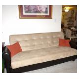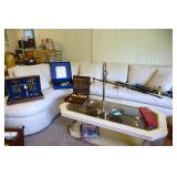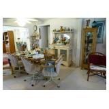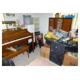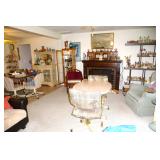 Baldwin piano; electronic keyboard Fireplace mantle Modern metal-clad dresser & nightstands Curio cabinets, display shelving Queen & full-size beds; chests, dressers Curved sectional sofa; other sofas, recliner Dinette sets; end and coffee tables Barber-style chair; assorted side chairs Desks; wall units