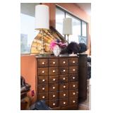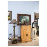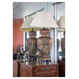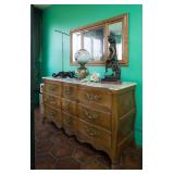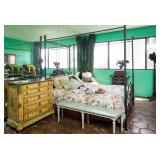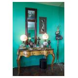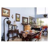 The furniture includes, but is not limited to, multiple tufted settees or sofas, an ornate carved dining table, multiple accent chairs, needlepoint chairs, multiple marble topped side tables, two ornate dressers with metal accents and marble top, multiple brass lamps, a canopy bed, multiple dressers, a vintage medicine cabinet or storage cabinet, vintage trunks, an Asian style coffee table, an Asian style cabinet, a desk, multiple ornate mirrors, multiple Tiffany style lamps, multiple coat racks, multiple antique lamps, a number of decorative pots, and more.