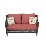 Hampton Bay Woodbury All-Weather Wicker Patio Loveseat with Chili Cushion. The country beauty found in this Hampton Bay Woodbury All-Weather Wicker Patio Loveseat will create a cozy getaway right outside your home. Richly woven frames and supportive cushioning make for a true rest-and-relaxation experience. The seat cushions come in soft, durable, all-weather fabric that is stain, mildew and fade resistant for lasting outdoor use. Rust-resistant aluminum on exposed frame areas and steel frame under weave are built to last Traditional, hand-woven aluminum frame with natural wood tone offers solid support Durable polyester cushions provide plush comfort Dragonfruit color brings a bright, eye-catching look for your outdoor space Includes 2 toss pillows with colorful floral motif to complete the set Stationary loveseat comfortably seats up to 2 people Easy assembly using included hardware and tools Easy to clean with mild soap and water; air dry. NEW! In retail package. Retails for $499.99. <72> |
