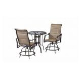 Hampton Bay Statesville 3-Piece Outdoor Balcony Height Dining Set. *COMPLETE IN 2 BOXES*. Create a cozy and elegant dining space with the Statesville 3-Piece Aluminum High Dining Set. Durable, rust-free aluminum frames are powder-coated for protection. The set includes 2 swivel motion chairs, and a bistro table with a glass top, perfect for entertaining. Durable and rust-free aluminum frame Weather-resistant padded sling for added comfort Swivel motion chairs make it easy to sit back and relax Tempered glass tabletop creates a beautifully smooth and sturdy surface for dining Easy to clean with warm water, gentle soap, and soft cloth. NEW! In retail package. Retails for $399.00. <75> |